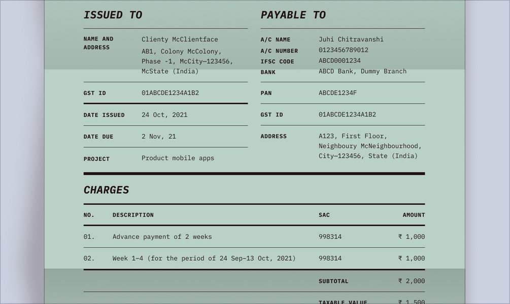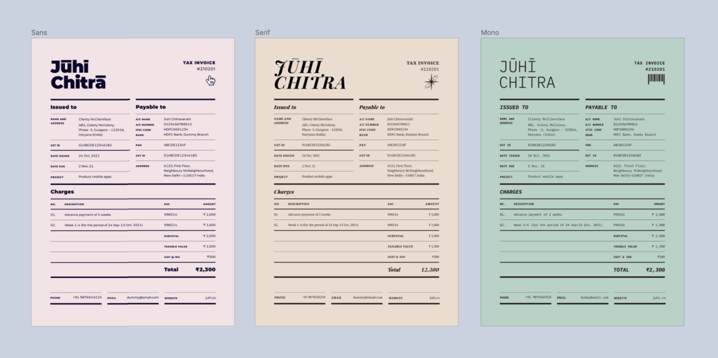 - With fields for GST, PAN, SAC code etc.—everything needed for tax purposes in India